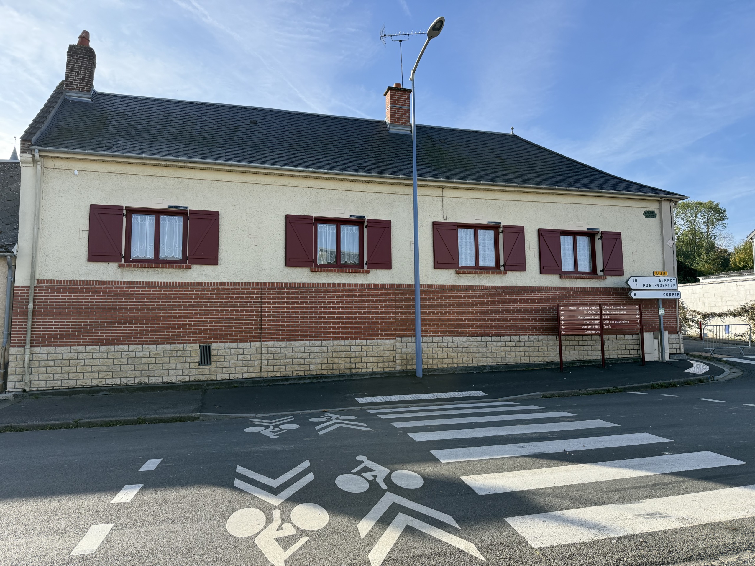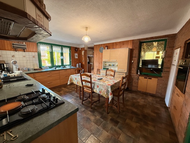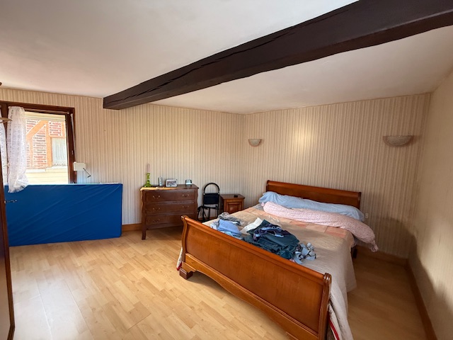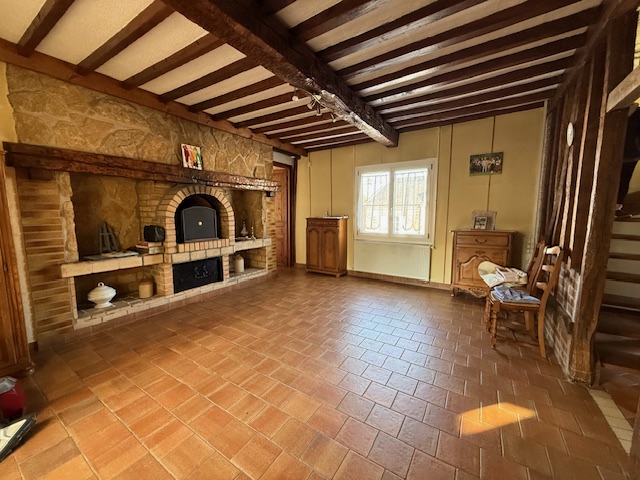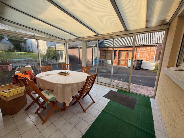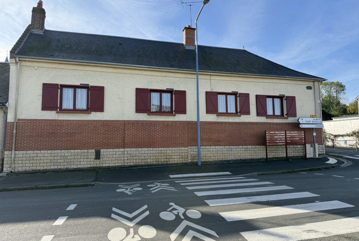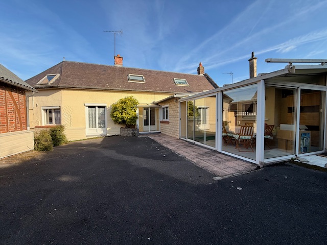 Maison picarde de 142 m² habitables comprenant : Hall, salon avec cheminée, salle, cuisine aménagée, 2 chambres de plain pied, salle de bain et wc. Véranda.