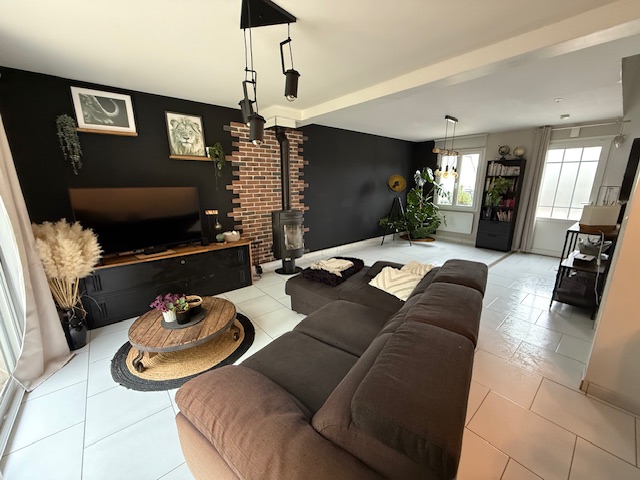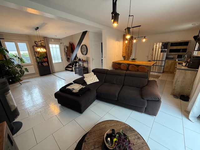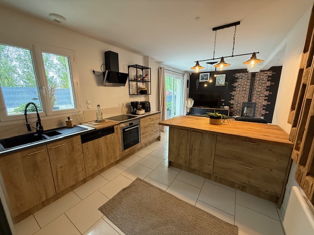 Pavillon récent comprenant : Un beau séjour avec poêle, cuisine équipée ouverte, une chambre de plain pied et wc.
